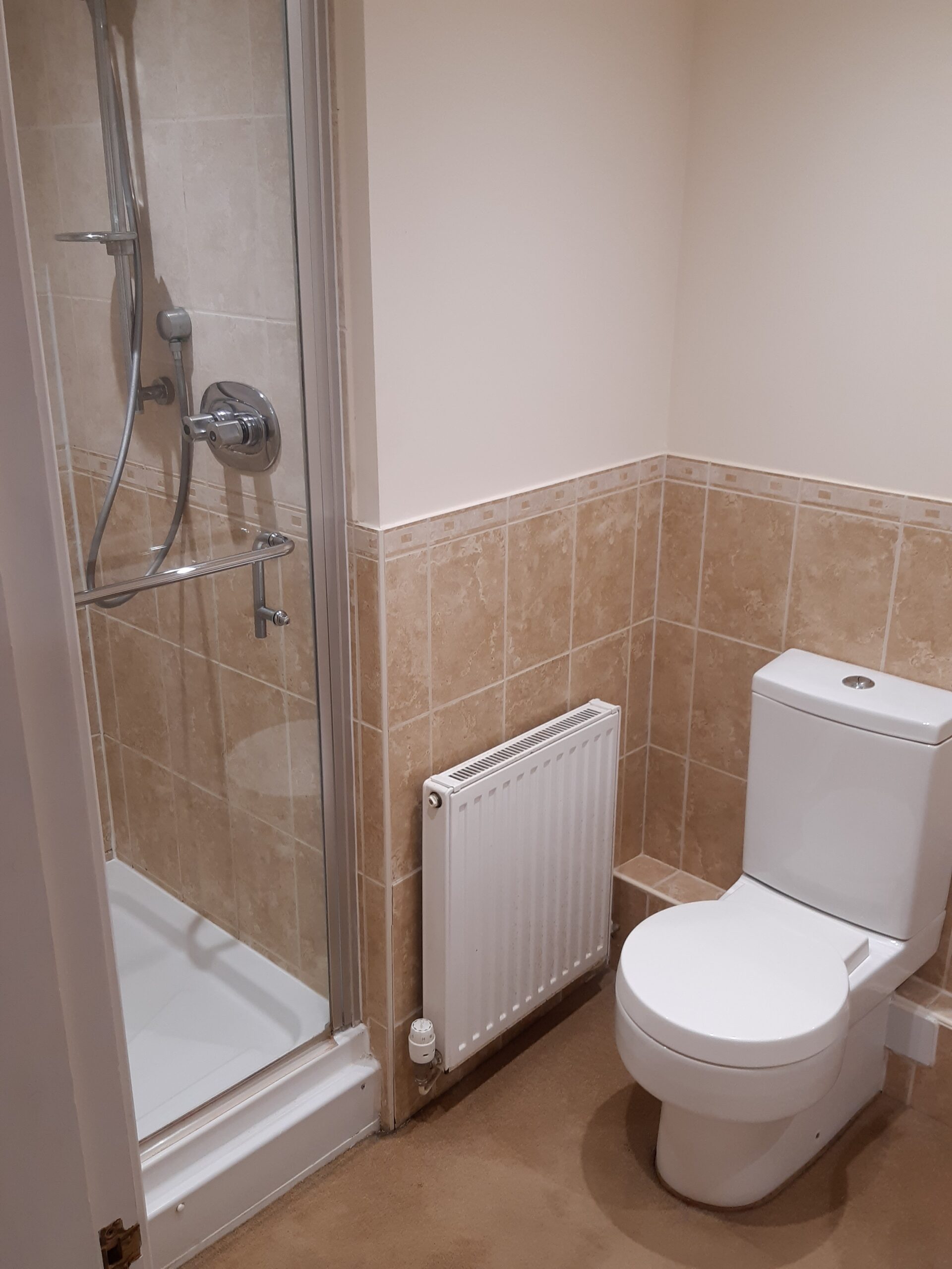 Fully tiled to walls, radiator.