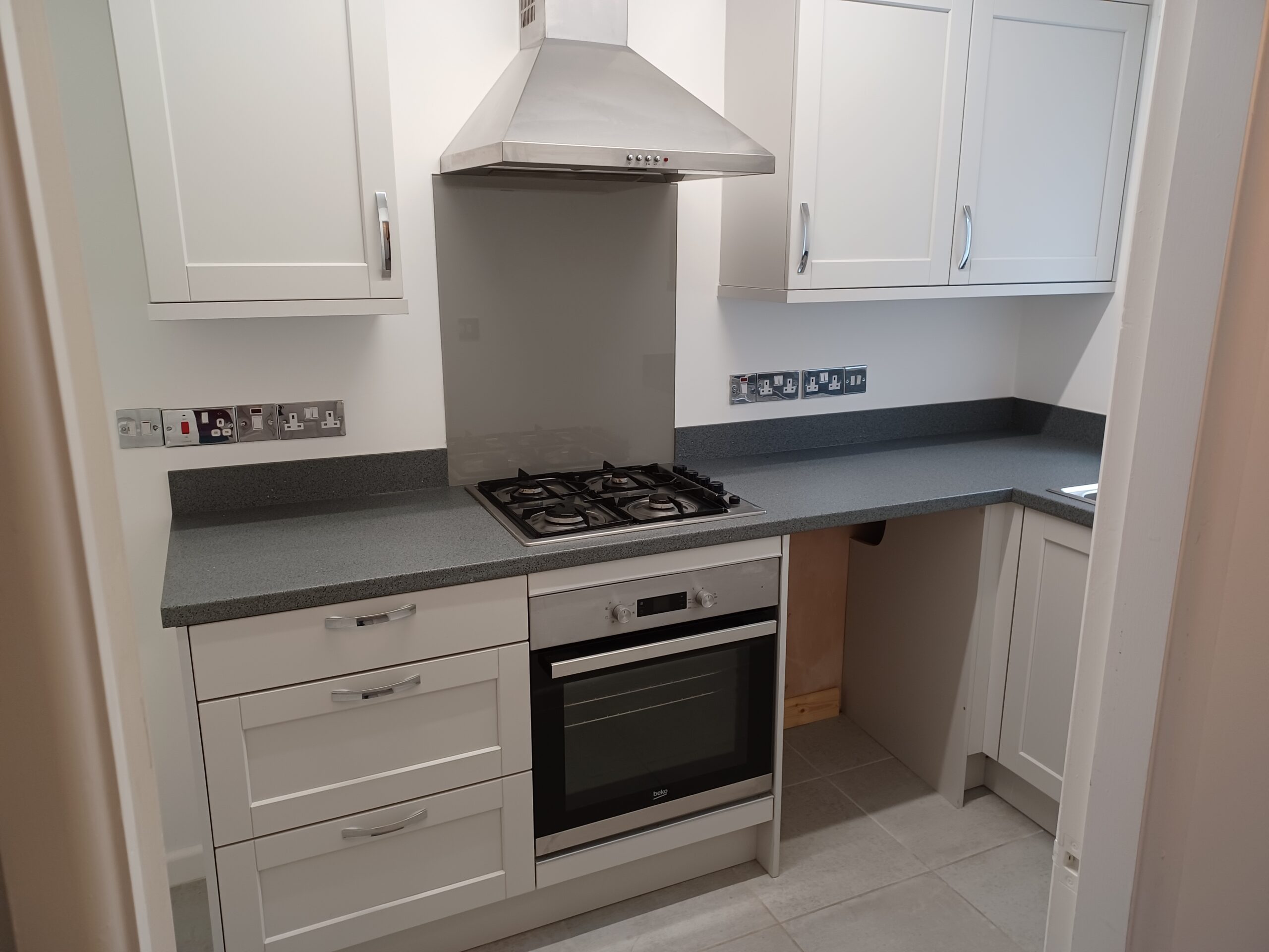 Kitchen. Room Dimensions: 3.23m(10’7″) x 1.65m(5’5″) With range of modern units incorporating a built in oven and hob. Recess for a fridge and plumbing for a washing machine