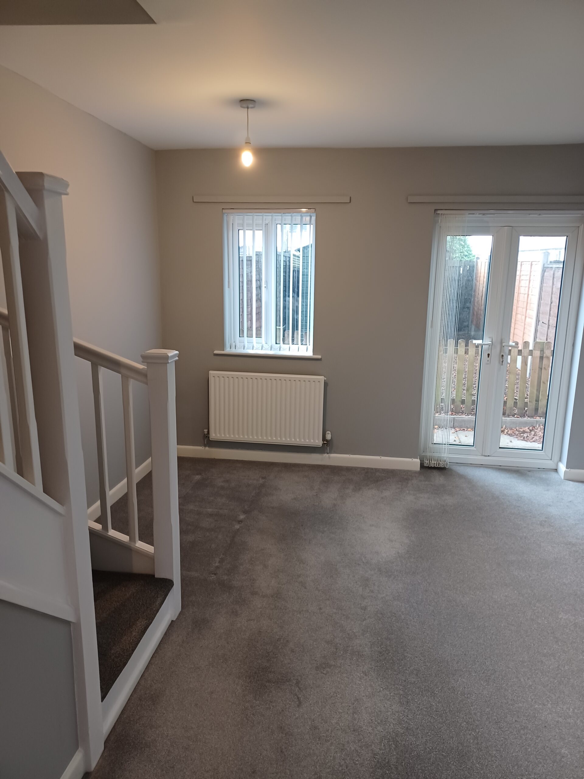 Open Plan Living Room Dimensions: 3.94m(12’11”) x 3.96m(13’0″) Lounge/diner. With patio doors to rear garden and stairs to first floor.